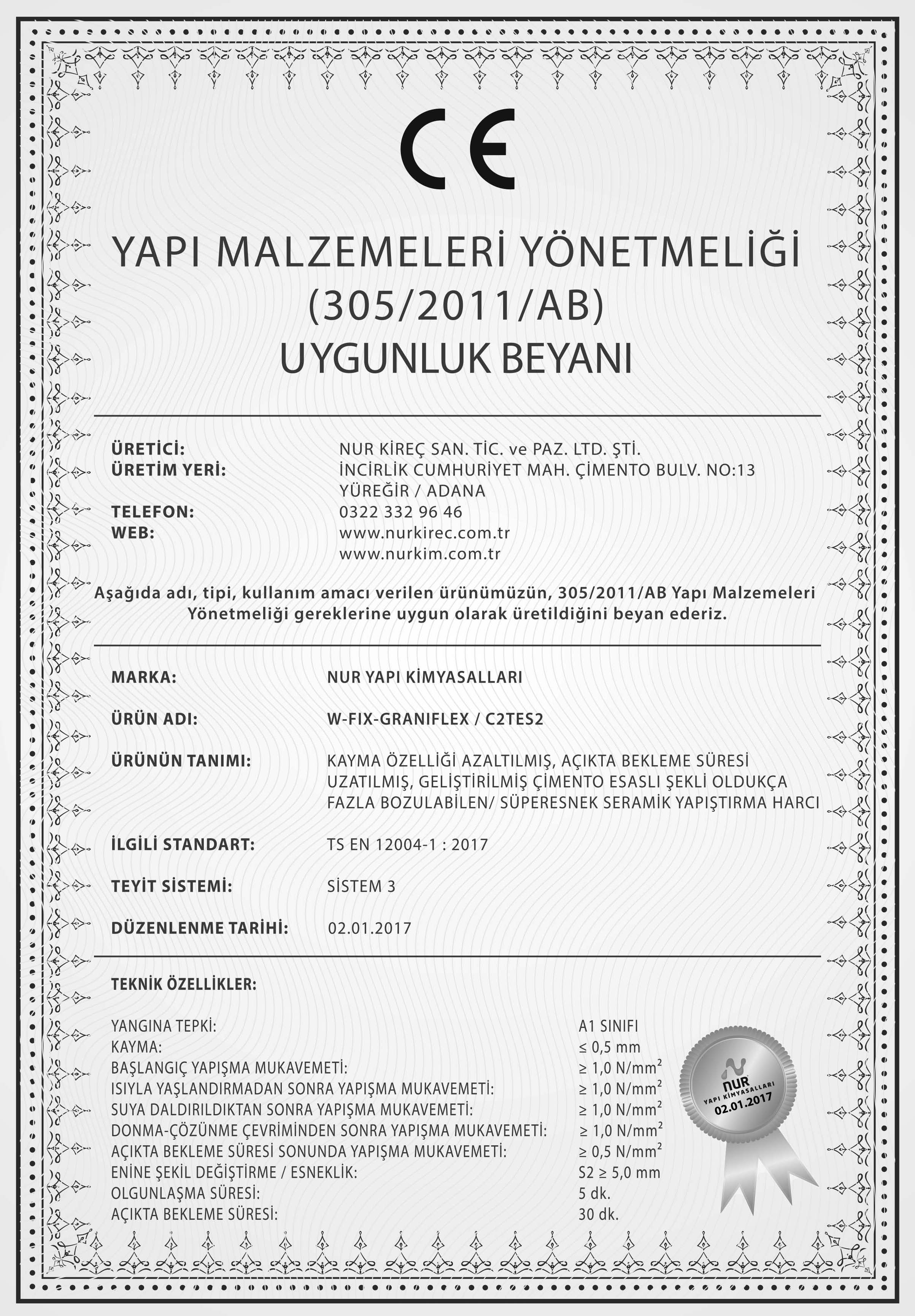 | TS EN 12004-1 / 04.2017Kayma Özelliği Azaltılmış, Açıkta Bekleme Süresi Uzatılmış, Şekli Oldukça Fazla Bozulabilir, Geliştirilmiş Çimento Esaslı Seramik Yapıştırma Harcı (C2TES2) | |