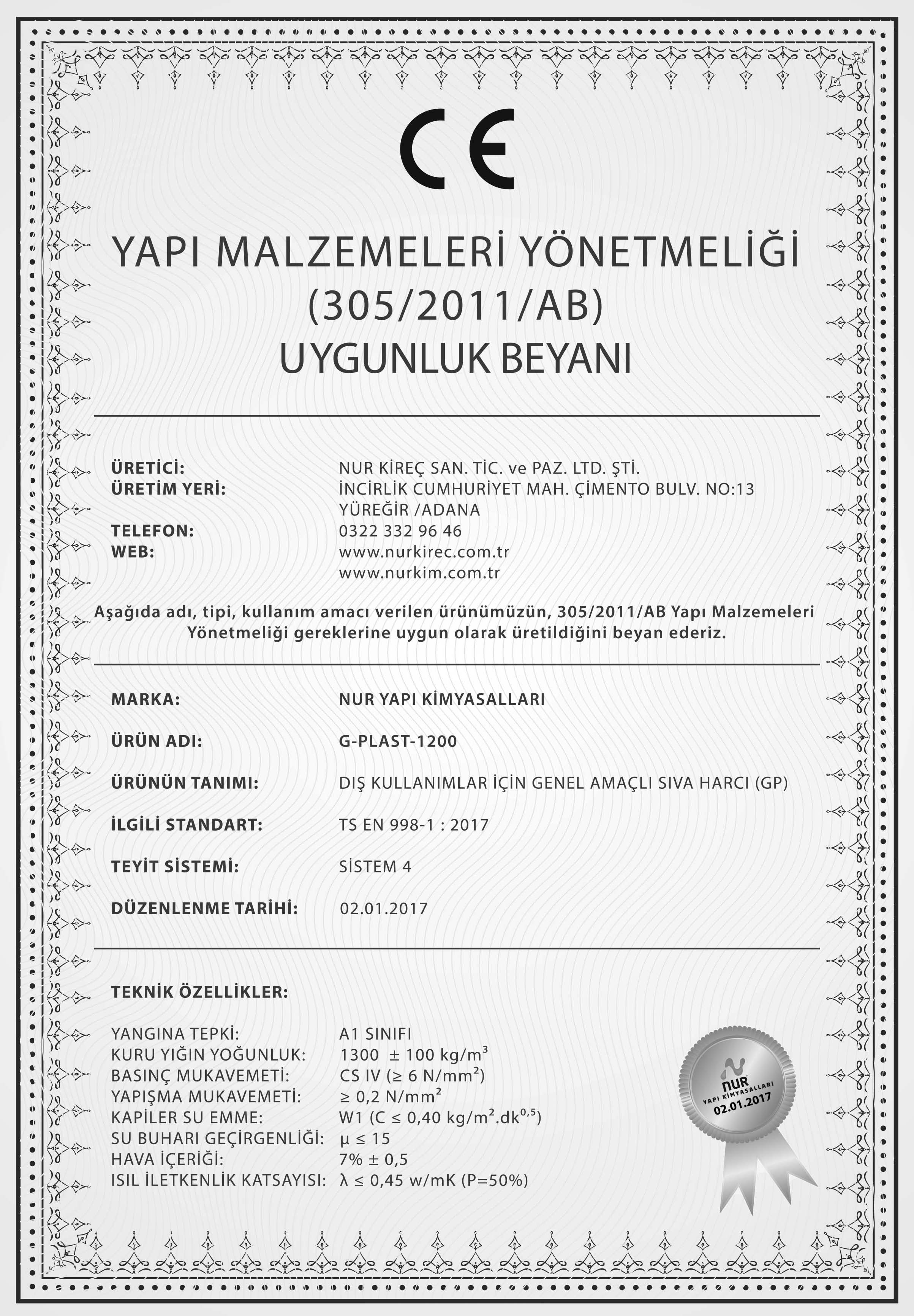 | TS EN 998 - 1 / 02.2017 İç ve Dış Kullanımlar İçin Genel Amaçlı Sıva Harcı (GP) | |